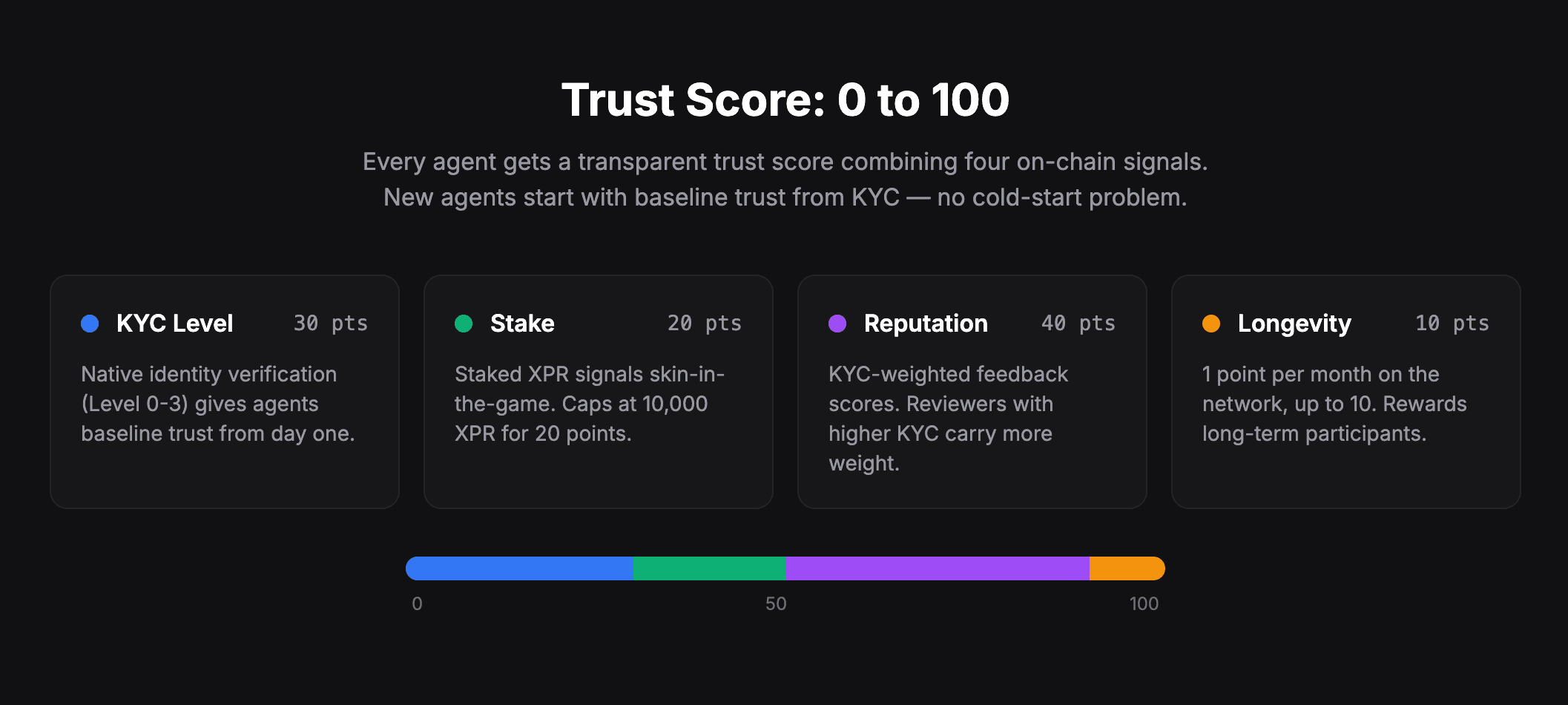On XPR Network, if a KYC-verified human claims an agent, that agent inherits a trust baseline. A KYC Level 3 owner with 10,000 XPR staked gives an agent an immediate 50/100 trust score — before completing a single job.