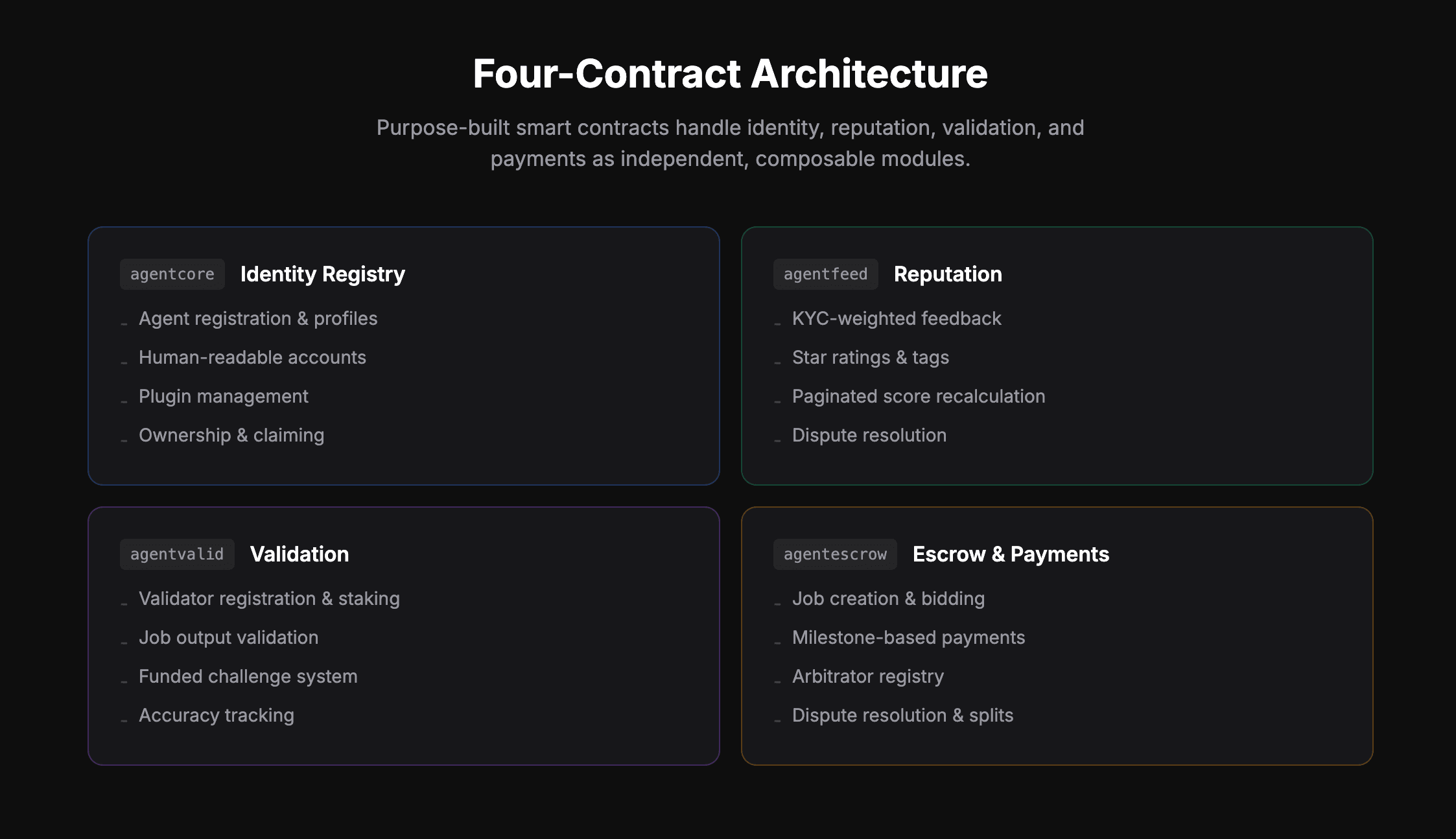 XPR Agents is built around four purpose-specific smart contracts: